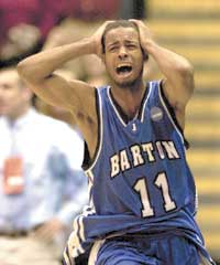 Barton’s Anthony Atkinson turns around in disbelief after scoring the final basket to complete an improbable come-from-behind victory over Winona State in the Division II Men’s Basketball Championship game. Atkinson scored his team’s final 10 points to erase a seven-point deficit in the game’s final 45 seconds. Suzanne Ouellette/NCAA Photos.