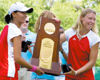 Brigham Young-Hawaii tennis players Jing Jing Liu (left) and Yuliya Ustyuzhanina display the Division II Women’s Tennis Championship trophy after their team’s victory over West Florida. Matt Mariott/NCAA Photos.