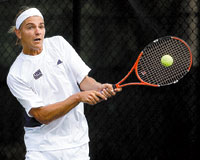 Lynn’s Denis Reinert returns a shot from Valdosta State’s Leos Jelinek during the singles portion of the Division II Men’s Tennis Championship. Reinert teamed with Dennis Riegraf to win in doubles and was ahead in the third set of his singles match when Lynn clinched the title. Matt Mariott/NCAA Photos.