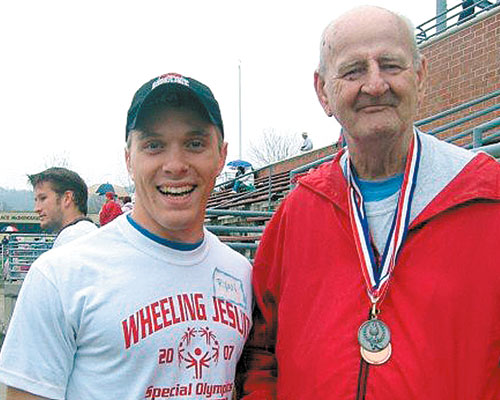 Special Olympians honored — Wheeling Jesuit University hosted the Area I Special Olympics for West Virginia this spring. The school’s track teams ran the track and field events while the Student-Athlete Advisory Committee coordinated the rest of the event. Lacrosse student-athlete Ryan Ferris congratulates his friend on a track victory.