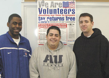 Aurora tax preparers — Three student-athletes were among 50 Aurora University students who recently prepared and electronically filed income tax forms free for 380 Chicago-area taxpayers. Basketball student-athlete Jeremy Cartwright (left), tennis student-athlete Cole Guetschow and basketball student-athlete Adam Berlin assisted with the fourth annual Volunteer Income Tax Assistance program, a partnership with the Internal Revenue Service. Students in a Federal Taxation of Individuals course at Aurora spent six Saturday mornings preparing and filing state and federal returns. Class members helped taxpayers claim $313,097 in refunds, including an $8,000 refund for one taxpayer.
