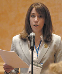 Emily Pankow, a Division III Student-Athlete Advisory Committee member representing Luther College, urges adoption of a proposal to require the presence of an individual certified in emergency responses at all student-athlete competitions and practices. Delegates, citing issues with the proposal, referred it for further committee discussion. Stephen Nowland/NCAA Photos.
