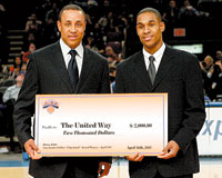 The New York Knicks, represented by retired NBA all star and team community-involvement advisor John Starks (left), made a donation to The United Way on behalf of basketball student-athlete Dana John from New Jersey City University, who was selected during April as the Knicks’ Sweetwater Clifton City Spirit Award recipient.
