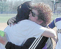 Charlotte Slocum of College Misericordia is congratulated by her daughter Cindy, who assists her mother in coaching the school’s softball team, after Slocum earned her 600th career coaching victory.