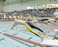 Swimmers start the final heat of the 1,650-yard freestyle during the Division III Men’s Swimming and Diving Championships. Kenyon’s Eric Dunn won the event along with the 500-yard freestyle to help the Lords outdistance Denison in the team standings. Dave Einsel/NCAA Photos.