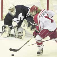 Middlebury goalie Lani Wright prepares for a shot by Plattsburgh State’s Danielle Blanchard during the Division III Women’s Ice Hockey Championship game. Wright stopped 22 shots during the game, but Plattsburgh State’s two goals were enough to give the Cardinals their first title. Todd Bissonette/NCAA Photos.