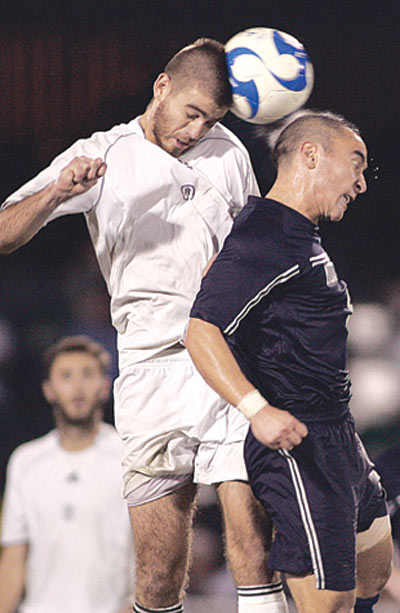 Soccer sandwich — Trinity University (Texas) midfielder Robert C’deBaca (right) heads the ball away from Middlebury College’s Alex Elias during the Division III Men’s Soccer Championship game November 24. The teams played to a scoreless tie in regulation and overtime, but Middlebury won the title on penalty kicks. See story in the Division III section.