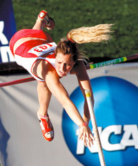 Rachel Secrest, one of three pole vault qualifiers from North Central (Illinois), just missed scoring in the event, which was won by Meghan Voiland of Augustana (Illinois). Allen Fredrickson/NCAA Photos.