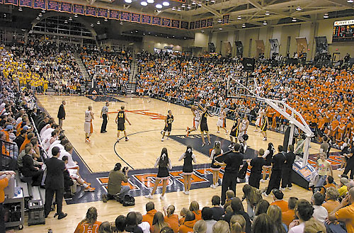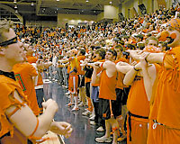 Hope’s fans, dubbed “the Dew Crew,” thanks to sponsorship by Mountain Dew, sport orange T-shirts and sit together facing the team bench. Before tip-off, the students take part in a group stretch, loosening up for 40 minutes of active cheering for their classmates.