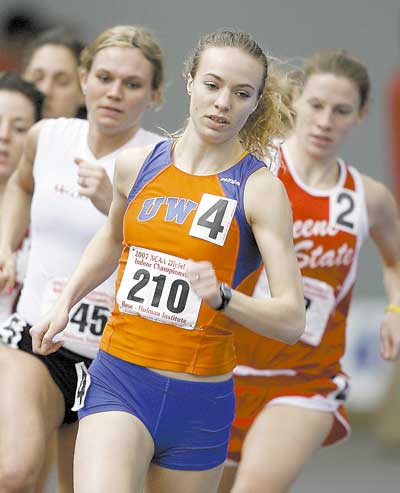 Winning stride — Marcia Taddy of the University of Wisconsin, Platteville, heads the field on her way to winning the 800-meter race at the Division III Women’s Indoor Track and Field Championships March 9-10 in Terre Haute, Indiana. Williams College took the team title.