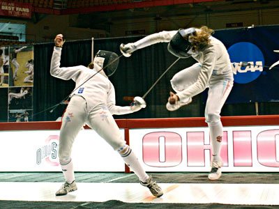 The top-ranked Ohio State women’s squad set the stage with a strong performance that registered 101 points en route to the national championship. The Buckeyes’ Siobhan Byrne earned the top seed in the medal round for the sabre and advanced to the final to face Notre Dame freshman Sarah Borrmann in a back-and-forth match. Byrne took a quick 4-0 lead before Borrmann responded to even the score, 5-5, and eventually pull ahead for an 8-7 advantage at the break. Borrmann maintained the lead and went on to capture the women’s sabre title, 15-11. Columbia’s Emily Jacobson, the 2005 champion, was third.