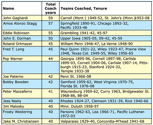 John Gagliardi, the legendary football coach at St. John’s (Minnesota), began his NCAA-record 60th season overall and 56th season at the school when the Johnnies held their first practice of the season August 15. Gagliardi is the all-time leader in NCAA football seasons coached for all divisions. Former Chicago and Pacific head coach Amos Alonzo Stagg is second with 57 seasons coached.