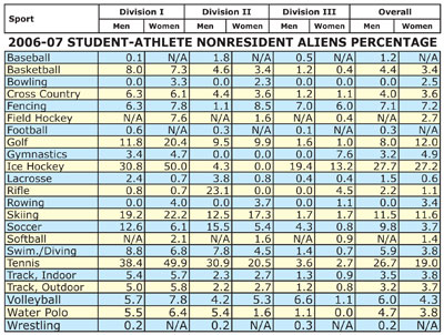 At the divisional levels, the percentage of male and female nonresident aliens competing in Division I rose from 2.4 percent for both in 1999-00 to 6.3 and 7.5 percent, respectively, in 2006-07. Over the same period, the percentage of international male and female student-athletes in Division II increased from 2.5 and 1.6 percent to 4.6 and 4.5 percent, respectively. While there also was an increase in male and female nonresident alien student-athletes in Division III, the report attributed the bump to the change in methodology since it occurred primarily between 2005-06 and 2006-07.