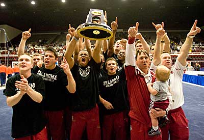 Down nearly two points to top-seeded Stanford with two competitors to go in the final rotation, the Oklahoma men’s gymnastics team finished strong on rings to win the school’s eighth men’s gymnastics championships team title April 18 at Stanford. Penn State junior Casey Sandy won the individual all-around title a day later.