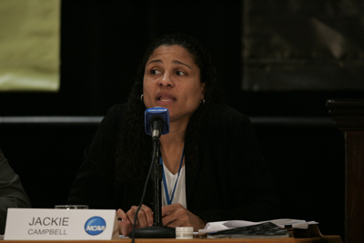 Division I Management Council Chair Jackie Campbell came to intercollegiate athletics in a round-a-bout way. A two-sport student-athlete at Virginia, she once thought her future was in professional sports administration. But more than 20 years later, Campbell, currently an associate commissioner of the Atlantic-10 Conference, is in the midst of an intercollegiate athletics career that includes stints at the NCAA national office and two campuses.