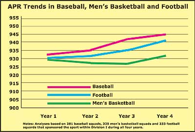 Overall, the Division I single-year APR has risen nearly four points since data collection began. Several sports have seen increases as well. Since 2003-04, for example, baseball’s APR increased 12 points and football went up nearly 11 points.