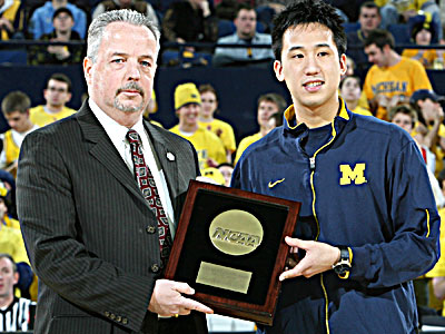 Michigan tennis standout Brian Hung was recognized with the NCAA Sportsmanship Award at halftime of the Wolverines’ men’s basketball game against Penn State February 9. Dan Mara, chair of the NCAA Committee on Sportsmanship and Ethical Conduct and commissioner of the Central Atlantic Collegiate Conference, made the presentation.