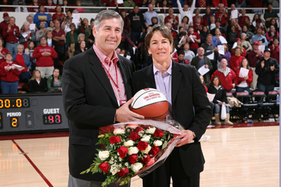 After the victory, VanDerveer's players each congratulated her, and she accepted a bouquet of roses from Athletics Director Bob Bowlsby.
