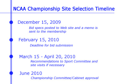 The request for bids, excluding those for the Division I Men’s and Women’s Basketball Championships, the Division I Baseball Championship and the Division I Football Championship, will begin with general and sport-specific bid requirements becoming available on the NCAA Web site December 15.