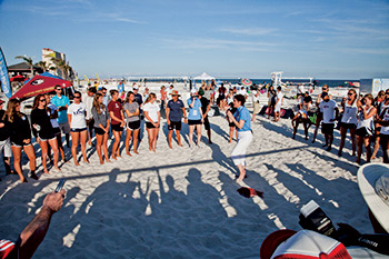 Kathy DeBoer addresses the women participating in the first collegiate sand volleyball championship tournament as pioneers in their sport.