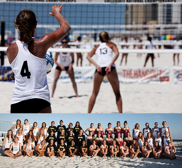 Top: Pairs compete on the five-court layout during the inaugural AVCA tournament. Above: Teams from Pepperdine, Long Beach State, Florida State and the College of Charleston pose before the finals.