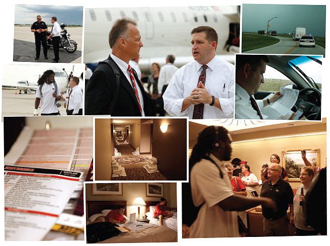 Clockwise: Head to airport to review escort route with patrolmen. Welcome football players and staff upon arrival. Confirm itinerary with head coach Mark Richt. Guide convoy to hotel before (and during) torrential rainstorm.. Get team and coaches checked in and settled in rooms. Sort players’ information cards.