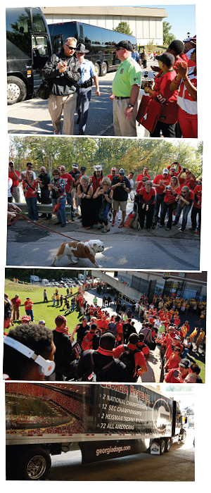 Top to bottom: Arrive at stadium; unload buses, including mascot Uga, at designated stadium entrance. Oversee the “Dawg Walk.” Make sure semitrailers of equipment arrive and drivers know where to park and unload.