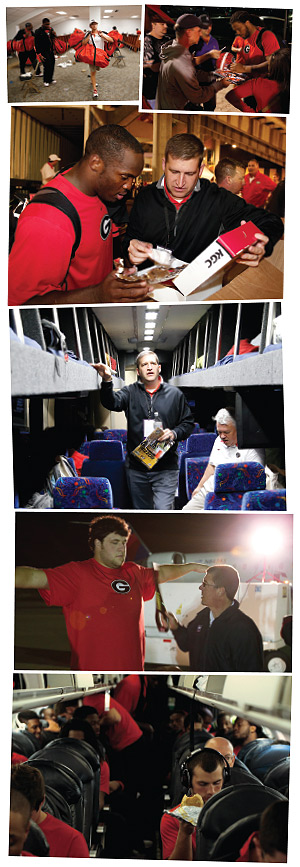 It’s a hectic scene as Richt and several players who had key roles in the game are doing media interviews. All the while, student-managers are loading an equipment truck for the 12-hour ride back to Athens. The truck drivers, Joseph Buggs and Charlie Lumpkin, will share shifts to get the load back safely.