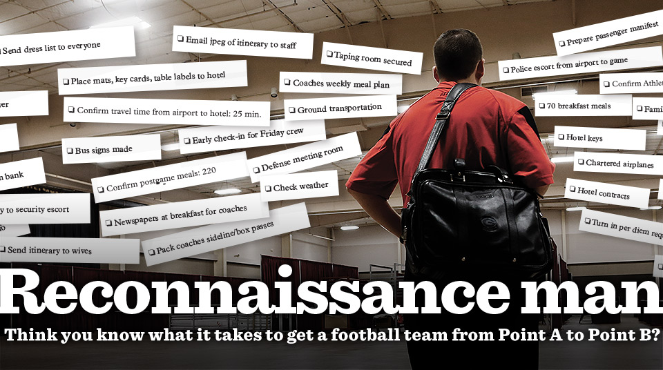 But that’s not easy when you’re paving the logistics path for a 140-person travel party and there’s a major college football game on the line.