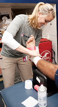 Graduate assistant athletic trainer Darbi Scherer tapes one of many ankles she’ll tend to shortly before Arizona kicks off.