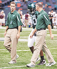 Tulane athletic trainer Danny Taylor (left) and team physician Greg Stewart help a Green Wave player off the field during a game last fall.