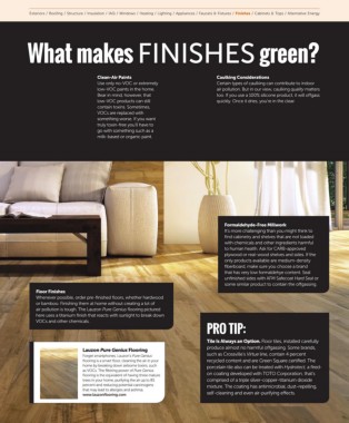 Exteriors / Roofing / Structure / Insulation / IAQ / Windows / Heating / Lighting / Appliances / Faucets & Fixtures / Finishes / Cabinets & Tops / Alternative Energy