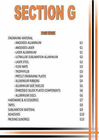 - ANODISED ALUMINIUM G1 - ANODISED LASER G1 - LASER ALUMINIUM G1 - ULTRALUXE SUBLIMATION ALUMINIUM G2 - LASER STEEL G2 - FLEXI MATE G3 - TROPHYFLEX G3 - PRECUT ENGRAVING PLATES G4 - ALUMINIUMRIBBONS G4 - ALUMINIUM SIDE SHIELDS G5 - EMBOSSED SILVER PLATED COMPONENTS G6 - ALUMINIUMDISCS G6