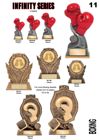 INFINITY SERIES 11 3 SIZES JW9084A 175mm JW9084B 205mm JW9084C 230mm RF19B 130mm For more Boxing Awards please turn to pages 33 to 49. RF19A 115mm RF19C 165mm RM149A 195mm RM149B 270mm BOXING