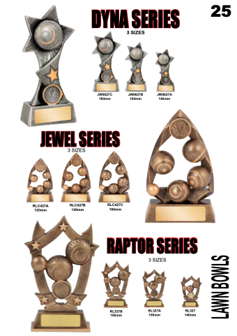 DYNA SERIES 25 3 SIZES JW9827C 180mm JW9827B 160mm JW9827A 140mm JEWEL SERIES RLC427A 120mm 3 SIZES RLC427B 140mm RLC427C 160mm RAPTOR SERIES 3 SIZES RL327B RL327A RL327 185mm 160mm 140mm LAWN BOWLS
