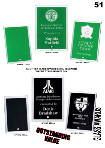 GP64GN - 150mm GP75GN - 180mm 5mm THICK GLASS REVERSE BEVEL EDGE WITH CHROME STRUT IN WHITE BOX. 51 GP86GN - 200mm GP86BK - 200mm GP64BK - 150mm GP75BK - 180mm GLASS AWARDS OUTSTANDING VALUE