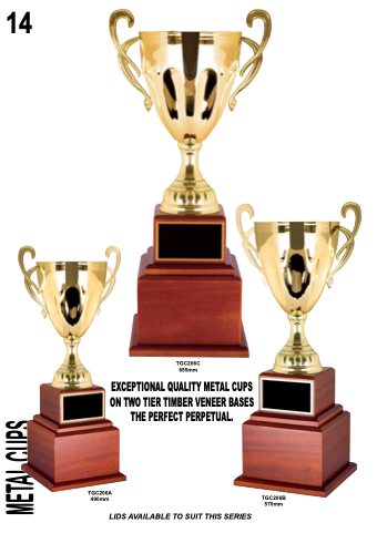 14 14 TGC206C 655mm EXCEPTIONAL QUALITY METAL CUPS ON TWO TIER TIMBER VENEER BASES THE PERFECT PERPETUAL. TGC206A 490mm TGC206B 570mm LIDS AVAILABLE TO SUIT THIS SERIES CUPS METAL CUPS