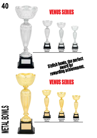 40 40 VENUS SERIES TGC096C TGC096B TGC096A 320mm 280mm 235mm VENUS SERIES TGC097C TGC097B TGC097A 320mm 280mm 235mm Stylish bowls, the perfect award for rewarding achievement. CUPS METAL BOWLS