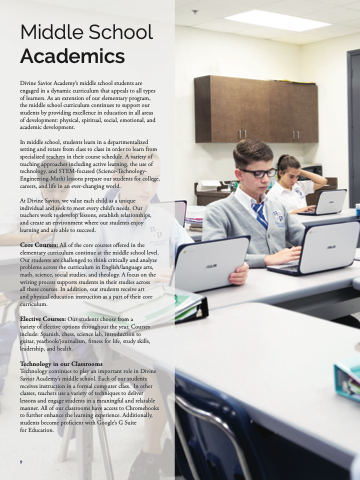 Technology continues to play an important role in Divine Savior Academy’s middle school. Each of our students receives instruction in a formal computer class. In other classes, teachers use a variety of techniques to deliver lessons and engage students in a meaningful and relatable manner. All of our classrooms have access to Chromebooks to further enhance the learning experience. Additionally, students become proficient with Google’s G Suite