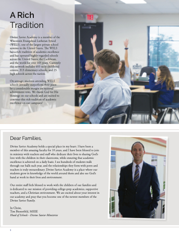 Divine Savior Academy is a member of the Wisconsin Evangelical Lutheran Synod (WELS), one of the largest private school systems in the United States. The WELS has a rich tradition of academic excellence and has operated highly-regarded schools across the United States, the Caribbean, and the world for over 165 years. Currently this network includes 403 early childhood centers, 313 elementary schools, and 25 high schools across the nation.