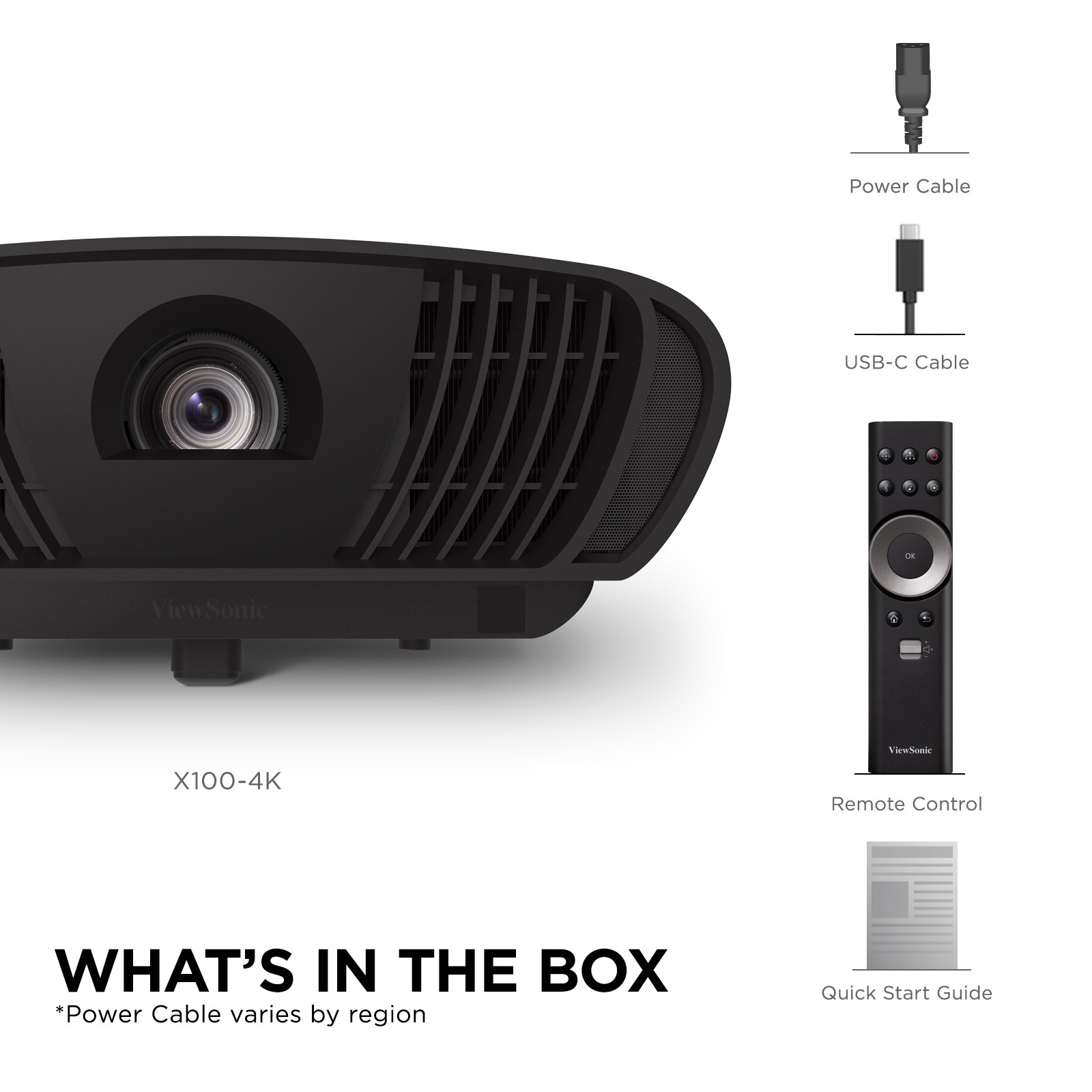 Combining stunning 4K resolution with smart streaming functionality, the ViewSonic ® X100-4K projector lets you experience home entertainment like never before. With a sleek, easy-to-install design, this projector can be ceiling mounted in any living room or dedicated home theater. Images remain vivid and clear thanks to 1,200 lumens of brightness, Rec. 709 compatibility, and stunning 4K Ultra HD 3840 x 2160 resolution. Integrated smart features for both Amazon Alexa and Google Assistant deliver the convenience of voice control. Featuring built-in Harman Kardon speakers and projecting screen sizes up to 300”, this premium 4K projector delivers an immersive cinematic experience perfect for movie buffs and home entertainment enthusiasts.