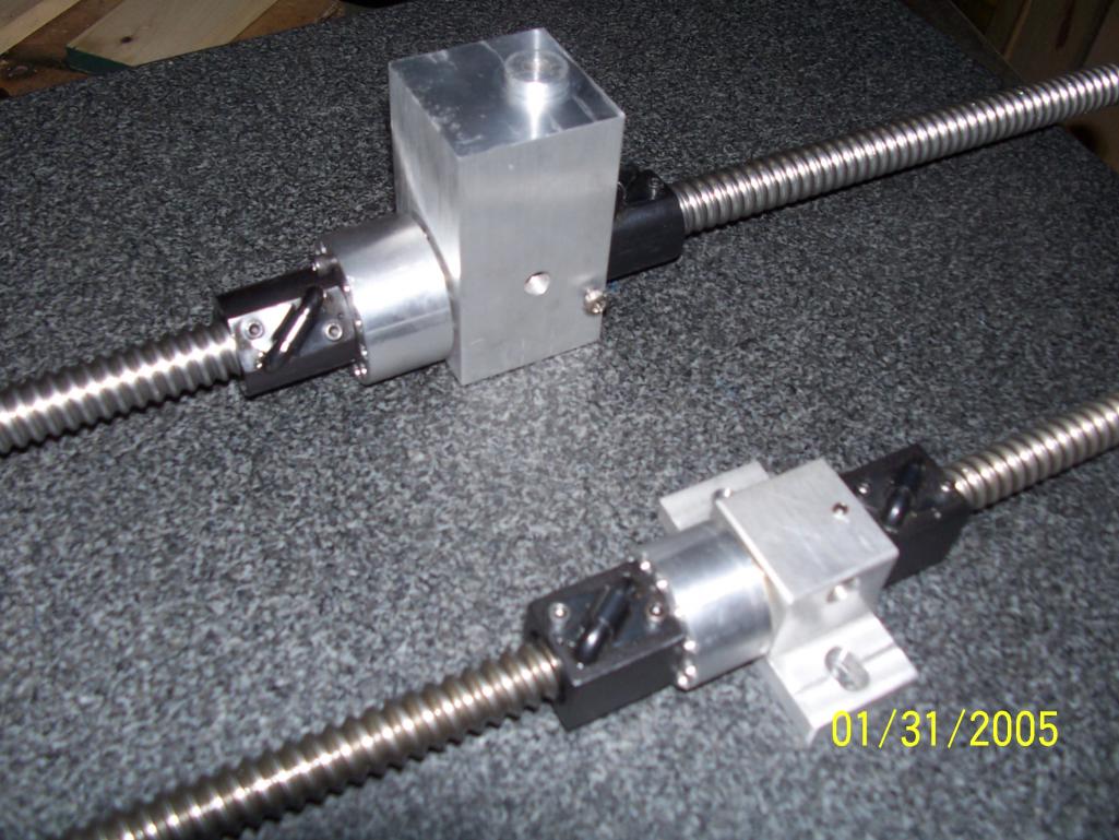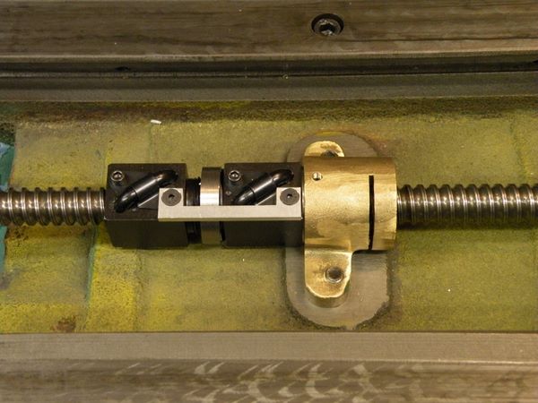 Those are the square Rockford ballscrews in 0.631" size. You can see there is a collar threaded onto the lefthand ballnut's mounting threads. It holds the Bellville's which push against an inside lip on the left and the body of the ballnut on the right. So far so good. The bracket on top is attached via 2 of the holes that hold the ball bearing return tubes in place on the ball nut. It keeps the ballnuts from rotating relative to one another. Just one problem unless I'm missing something: the bolts are also keeping the ballnuts a fixed distance apart which prevents the preload from working its magic. The nuts have to be able to "float" along the axis of the ballscrew.