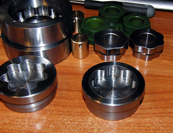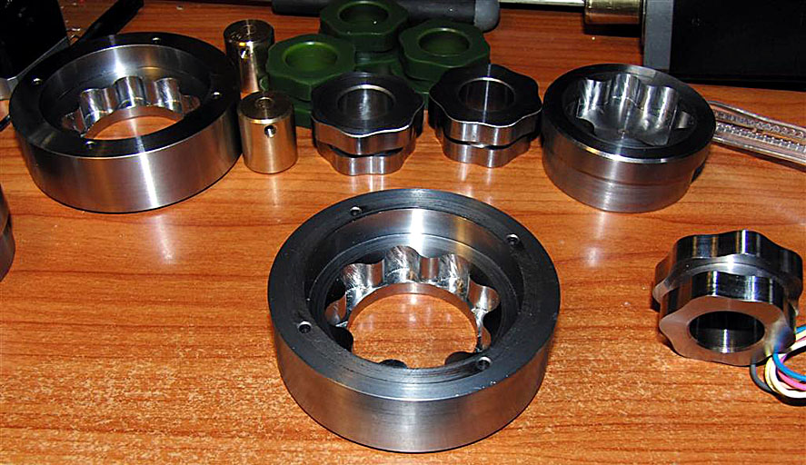 My first CNC parts. The one on the left has an 0.010" finish pass, and the one on the right is just roughed with a 0.050" depth of cut. The parts were profiled with a 3/16" 2 Flute end mill. This photo represents about 3X magnification over actual size. Full details on how I made them are on the Comber Rotary page...