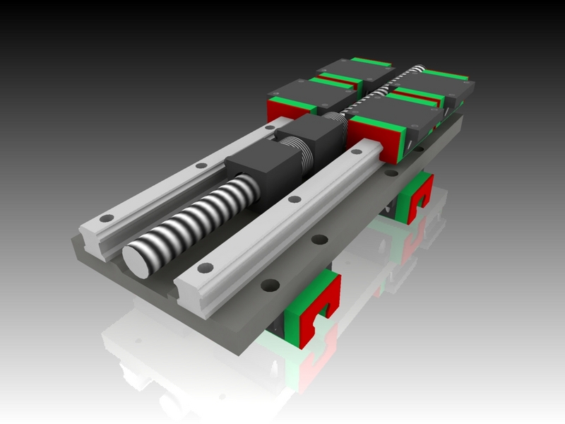 In this design, an outrigger from the ballnut mount (green) provides a sliding track for the rear ballnut (ballnuts are red). The Bellville preload assembly (gray) is threaded onto the rear ballnut and bears against the front ballnut.