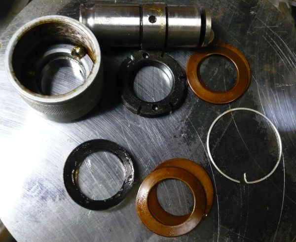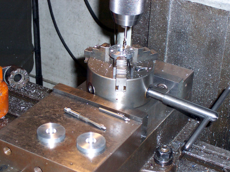 Disassembled view of the torque limited tapping chuck that came with John's tapping head. The torque is limited because 3 ball bearings in little pockets mate with the tapping head to drive the tap chuck. The balls are held in the pockets by the belville washers. Apply enough torque and the force from the washers is overcome, the balls pop up out of the pockets and nothing more happens. John is concerned the the impact "hammer" action is bad for the taps, but I've had no problems. This little impact wrench doesn't have a lot of guts to screw things up except perhaps on a very small tap. He does suggest it would be possible to disassemble the impact wrench and stop the hammering, and I may look into that at some point.