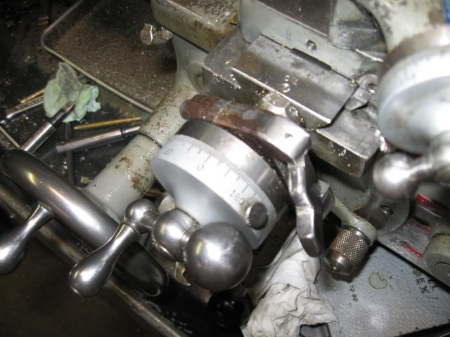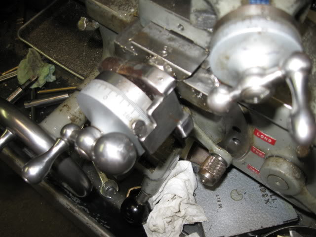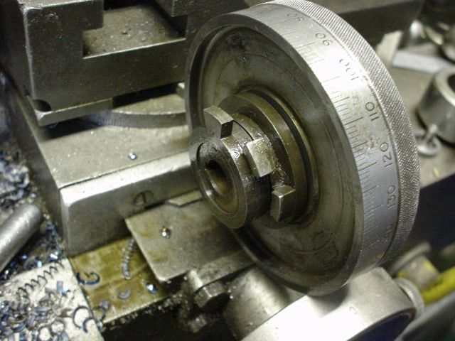 To engage the system, just wind the set screw in. It will engage the first of the three dogs. That gives you one rotation until the first dog engages the second, giving another rotation to engage the third for a last rotation. So you can turn the handwheel 3 rotations against the stops. The depth of cut is set by the top (compound) slide. Set the depth, crank the lower slide all the way to the stop, cut a pass, retract the lower slide to opposite stop, and traverse back for another pass. I kind of like the Swing Tooling better, but who can argue with the genius of Monarch? John has retrofitted this to some other lathe in his shop, a TOS I think?