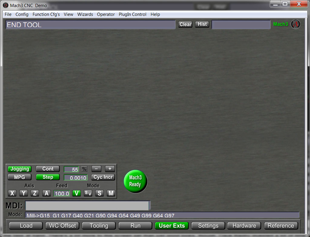 Let's start with consistent navigation. The bar along the bottom lists all the available screens. And it stays put--no matter which screen you're on, the bar is in exactly the same place with exactly the same choices. But that's not all. If we look at the "User Exts" screen, a place for you to put any extensions you've made to Mach3, you can see that the jogging and MDI clusters stay put as well: