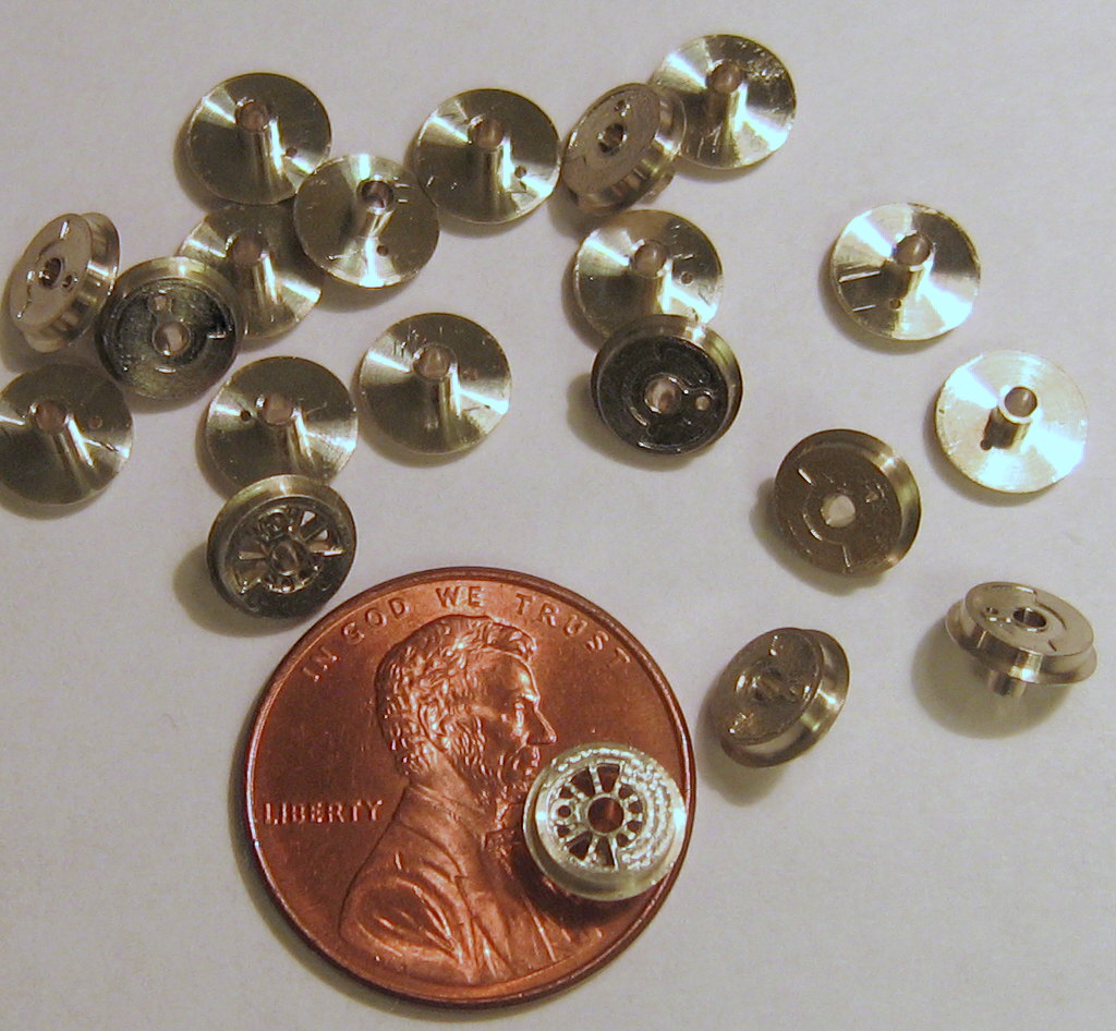 Tiny train wheels next to a penny...