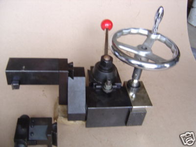 This turner goes up and over the top rather than side to side. Either method will work. Components consist of the arm that holds the tool, a level that delivers the up and over motion, the QCTP hub, and a worm and wheel gearbox with handwheel attached to move the cutting tool.