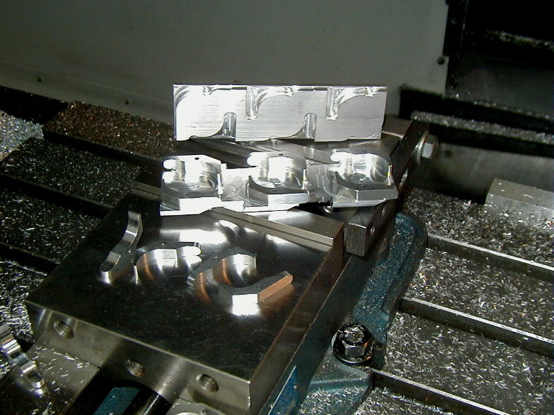 Flip fixture is at top, half machined parts in middle, finished parts at bottom...
